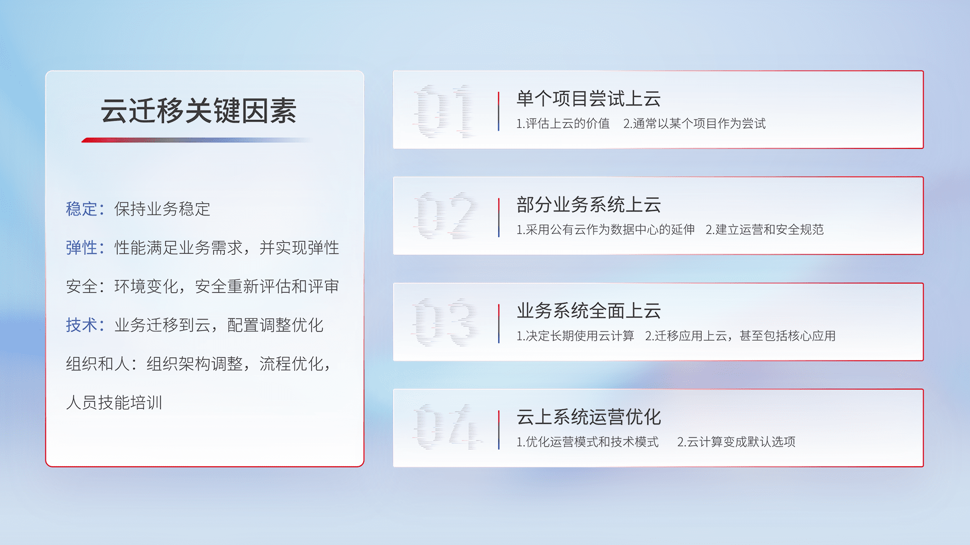 结合实际业务,,,,从规划设计、、、、云平台选型、、、云原生改造、、数据迁移、、集成交付,,,,迁移全过程为客户识别最佳上云路径,,做好风险识别管理,,,,设计网络架构、、、、身份权限、、、、安全审计合规、、、操作审计、、日志审计、、、、监控告警策略、、、、多站点容灾设计等,,,对云上基础设施进行整体规划,,提升IT治理水平,,,,以满足弹性、、、、高可用、、高性能的需求。。